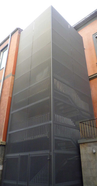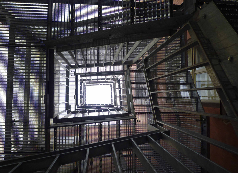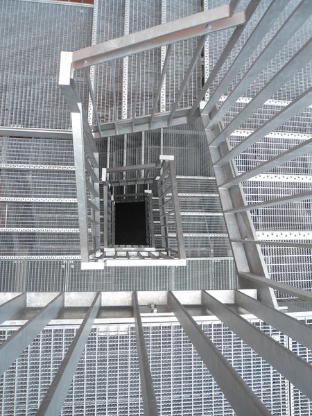 - Stahltragkonstruktion mit Treppenläufen und Podesten aus engmaschigen Gitterrosten